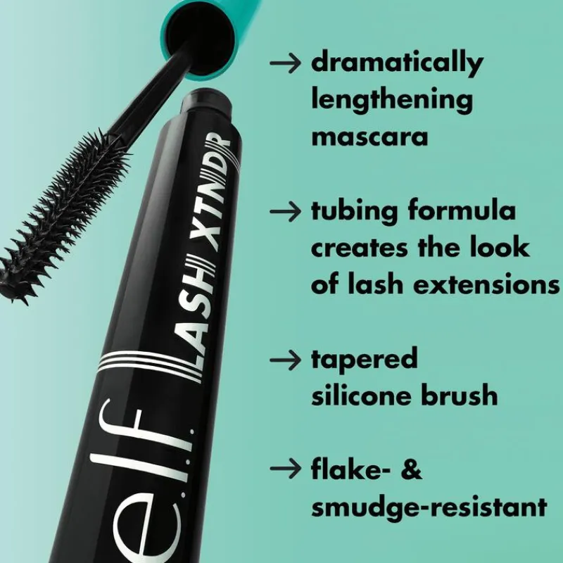 Wimperextensies in één beweging met de Lash XTNDR Mascara van e.l.f. Cosmetics. Deze verlengende mascara maakt gebruik van een lichte tubetechnologie om elke wimper in te pakken en zichtbaar langer te maken. Het taps toelopende siliconen borsteltje pakt en scheidt elke wimper voor een dramatische look. De formule is klont-, schilfer- en veegbestendig en verrijkt met jojobazaadolie om je wimpers te voeden en te verzorgen.