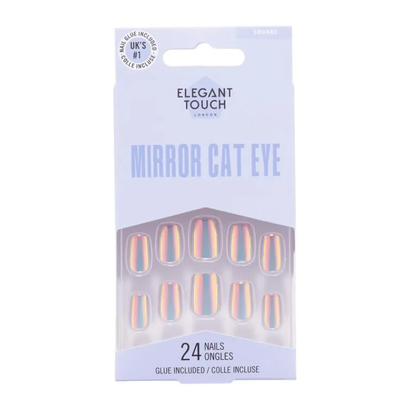 Elegant Touch Mirror Cat Eye Opaline. Nepnagels met Lijm 24st. Maak kennis met onze revolutionaire nieuwe Mirror Cat Eye Nail. Krijg 2 dynamische afwerkingen in één, met behulp van gemagnetiseerde technologie om een reflecterend cat eye-effect te creëren dat beweegt met het licht terwijl jij beweegt. Afgewerkt met een iriserende chrome topcoat voor de glanzende “mirror” effect en multidimensionale schittering.