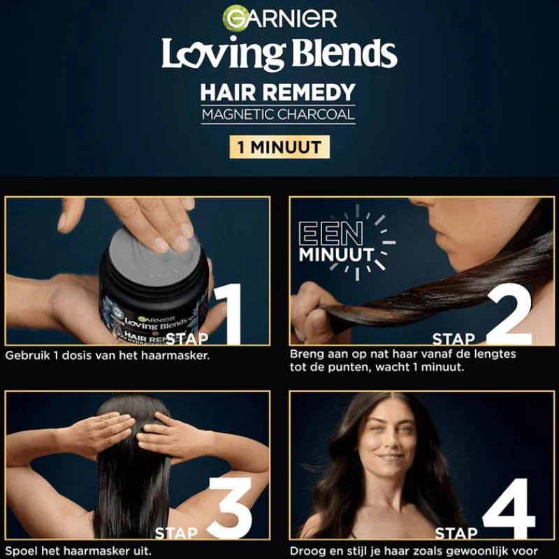 Het Loving Blends Magnetic Charcoal Masker van Garnier is een intens hydraterend masker van 97% natuurlijke oorsprong, speciaal ontwikkeld voor de droge lengtes. Het masker hydrateert de lengtes tot wel 72u*. Garnier Loving Blends heeft hiervoor een formule samengesteld die werkt als een magneet om hydratatie in te sluiten, voor gezonde & gevoede lengtes zonder vettig effect. De formule bestaat onder meer uit twee krachtige ingrediënten:- Actieve charcoal, bekend om zijn zuiverende werking – Zwarte komijnzaadolie, een eeuwenoud hydraterend beauty geheim rijk aan Omega 6 vetzurenHet masker bereikt het gewenste resultaat na slechts 1 minuut inwerking. Zo bespaar je tijd terwijl je haar optimaal verzorgd wordt.Formule zonder siliconen, voor een natuurlijk gevoel en zonder ingrediënten of bijproducten van dierlijke oorsprong in een 100% gerecyclede en recyclebare pot. Loving Blends is gecertificeerd door Cruelty Free International.Ontdek voor nog meer verzorging ook de bijhorende shampoo en conditioner.*Instrumentele test