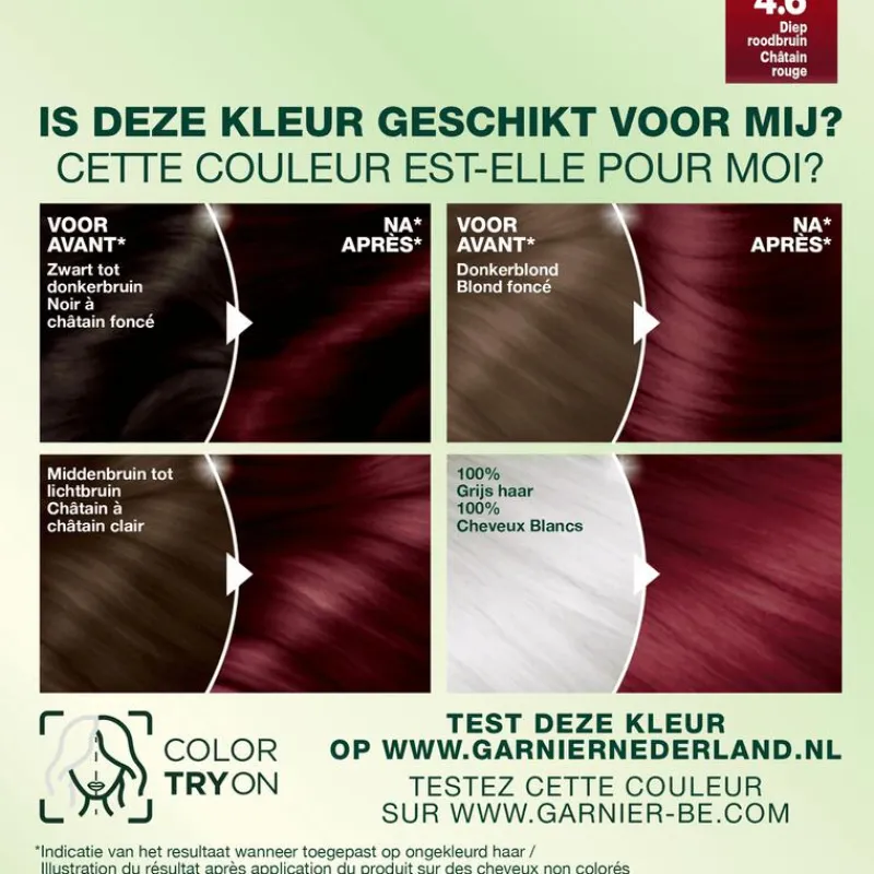 HAARKLEURSTOFFEN KUNNEN ERNSTIGE ALLERGISCHE REACTIES VEROORZAKEN. Lees en volg de instructies. Dit product is niet bestemd voor gebruik bij personen jonger dan 16 jaar.TIJDELIJKE TATOEAGES MET ZWARTE HENNA KUNNEN LEIDEN TOT EEN VERHOOGD RISICO OP EEN ALLERGISCHE REACTIE. Kleur je haar niet als: • Je last hebt van uitslag in het gezicht of van een overgevoelige, geïrriteerde of beschadigde hoofdhuid • Je eerder een reactie na een haarkleuring hebt gehad • Je in het verleden een reactie hebt gehad na een tijdelijke tatoeage met zwarte henna. ALLERGIE NEGEREN KAN LEVENSBEDREIGEND ZIJN. Het is noodzakelijk een ALLERGIE WAARSCHUWINGSTEST 48 uur vóór iedere haarkleurbehandeling uit te voeren zelfs indien je al eerder een kleurproduct hebt gebruikt. Denk eraan het product 48 uur van te voren te kopen. Lees en volg de gebruiksaanwijzing. Bij een reactie of bij twijfel, raadpleeg een arts voordat je een haarkleuringsproduct gebruikt.De “ontwikkelcrème” bevat waterstofperoxide. De kleurcrème bevat: fenyleendiaminen, resorcinol en ammoniak.• Bijgevoegde handschoenen dragen.• Contact van het product met de ogen vermijden. Niet gebruiken voor het kleuren van wimpers of wenkbrauwen.• Bij contact van het product met de ogen onmiddellijk met overvloedig water spoelen.• Spoel het haar na de inwerktijd van het product goed uit.Wacht met een kleurbehandeling minstens 2 weken na een permanent of een behandeling met een duurzaam gladmakend product. Niet gebruiken op haar gekleurd met henna of een progressieve kleuring. Buiten bereik van kinderen houden.