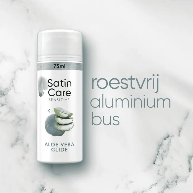 Gillette Satin Care Sensitive Skin Aloe Vera Glide Scheergel voor vrouwen is speciaal ontworpen voor de gevoelige huid, en laat je huid na elke scheerbeurt glad en satijnzacht aanvoelen.