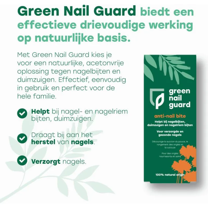 Green Nail Guard is speciaal ontwikkeld om je te helpen te stoppen met nagelbijten. Dit product bevat zorgvuldig geselecteerde ingrediënten van natuurlijke oorsprong. Green Nail Guard draagt ook bij aan het herstel en de verzorging van beschadigde nagels en nagelriemen.