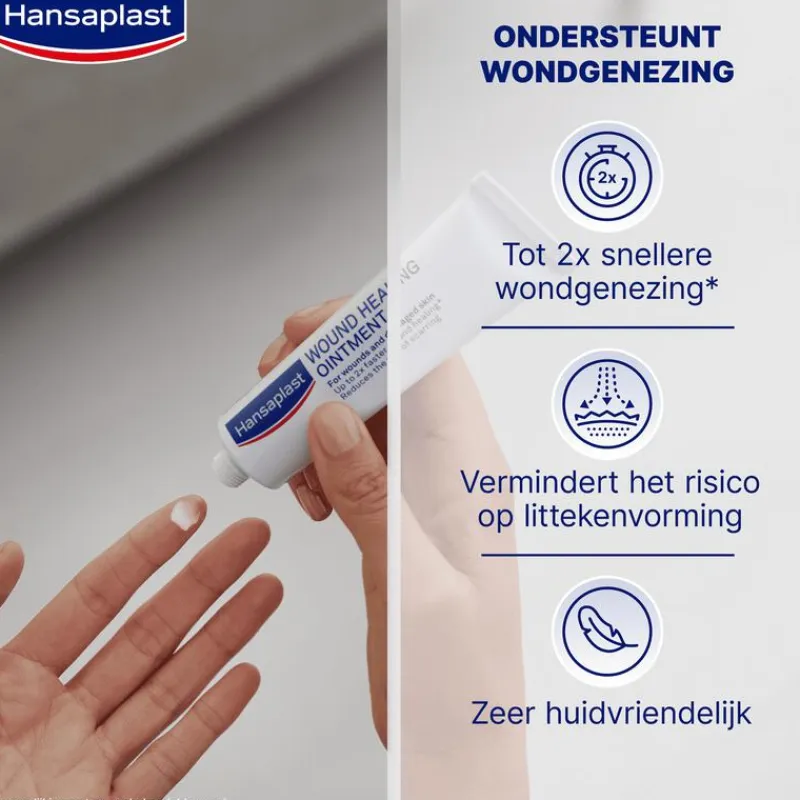 Hansaplast Wondhelende Zalf is ontwikkeld ter ondersteuning en bevordering van het natuurlijke genezingsproces van kleine oppervlakkige wonden, zoals sneeën, schaafwonden, krassen, maar ook voor eerste- en kleine tweedegraads brandwonden. Deze zalf kan op elk moment van het genezingsproces worden gebruikt op oppervlakkige open wonden en beschadigde huid. Het is klinisch getest dat een vochtige wondgenezing het natuurlijke wondgenezingsproces versnelt. Hansaplast Wondhelende Zalf vormt een ademende laag die de wond beschermt tegen externe invloeden en het uitdrogen van de wond voorkomt. Deze klinisch bewezen werking resulteert in snellere wondgenezing en vermindert het risico op littekenvorming. De Hansaplast Wondhelende Zalf is zeer huidvriendelijk, met een zachte formule die dermatologisch getest is en geschikt is voor baby’s, kinderen en de gevoelige huid*. De zalf is vrij van kleur- en geurstoffen en dierlijke stoffen. De formule, verrijkt met Panthenol, fungeert als een beschermende barrière om het vochtgehalte van de huid te behouden en creëert een ideale omgeving voor huidherstel. De zalf kan worden gecombineerd met standaard pleisters van Hansaplast, zoals Classic, Elastic, Sensitive en Universal, evenals kinderpleisters.
