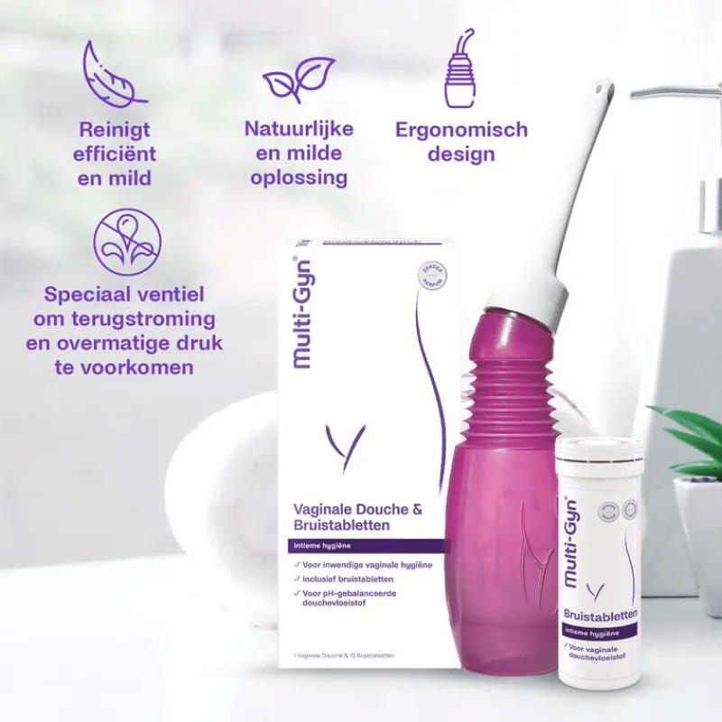 Multi-Gyn Vaginale Douche en Bruistabletten zijn ideaal voor algemene vaginale hygiëne. Of voor intensieve vaginale hygiëne in geval van overmatige afscheiding, jeuk, irritatie en een brandend gevoel. Spoelt schoon op efficiënte en milde wijze.