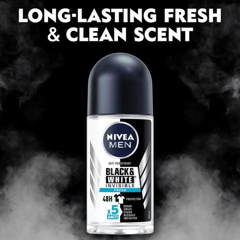 NIVEA MEN Black & White Invisible biedt bescherming tegen witte vlekken op zwarte kleding en tegen gele vlekken op witte kleding dankzij de unieke gepatenteerde anti-vlekken technologie. Het biedt betrouwbare 72 uur anti-transpirantbescherming, krachtig tegen zweet en geuren, en verzorgt je huid. De formules bevatten geen ethylalcohol. NIVEA Black & White biedt complete bescherming tegen zweet, geuren, vlekken, resten en irritaties, terwijl het zacht is voor de huid. Huidverdraagzaamheid dermatologisch bewezen. Onze anti-transpiranten bieden Derma 72u Active Protection: onze producten werken samen met de huid voor betrouwbare en krachtige werking tegen zweet en geur, met huidvriendelijke formules.
