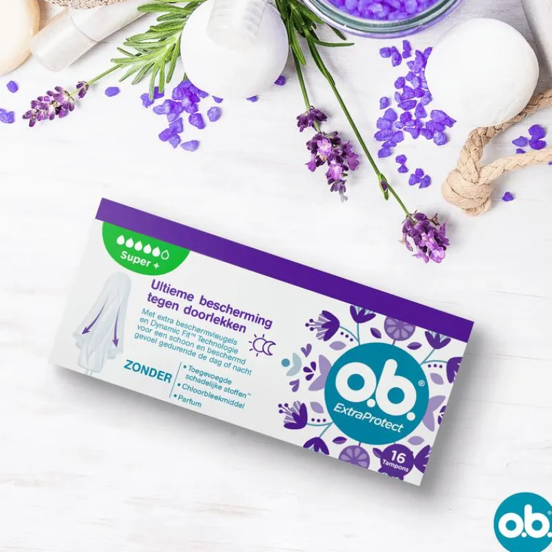 De o.b.® ExtraProtect Super Plus-tampons voor zeer zware menstruatiedagen combineren twee toonaangevende tampontechnologieën en bieden de ultieme bescherming tegen lekken (binnen het o.b.®-assortiment). De extra beschermingsvleugels ontplooien zich voorzichtig om vocht op te vangen dat bij gewone tampons soms ontsnapt. De unieke Dynamic Fit™-technologie met gebogen groeven helpt het vocht efficiënt verdelen in de kern van de tampon. Bovendien zijn de o.b.® ExtraProtect-tampons gynaecologisch getest, bevatten een 100% plantaardige kern en zijn vrij van schadelijke chemicaliën (bv. pesticiden), chloorbleekmiddel en parfum.