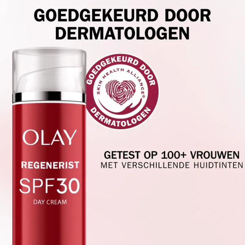 Hernieuw de natuurlijke gloed van je huid en bescherm deze tegen schadelijke UVA- en UVB-stralen met de Olay Regenerist Dagcrème met SPF30.
