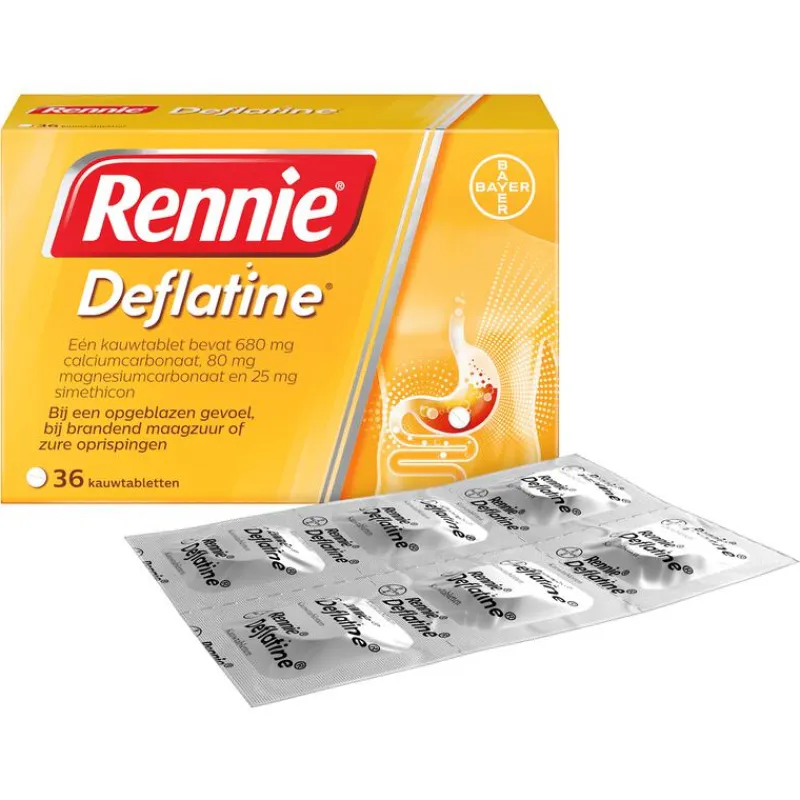 Rennie Deflatine bevat de werkzame stof simethicon, dat kleine gasbelletjes uit elkaar laat vallen in je maag en darmen. Hierdoor gaat het flatulentie tegen en neemt het gevoel van een opgeblazen buik af. Daarbovenop verlicht Rennie Deflatine ook brandend maagzuur binnen 2 minuten. Je maag is snel weer rustig zodat je weer van je dag of avond kunt genieten. Rennie is een maagzuurtablet en staat bekend als een maagzuurbinder. Dat betekent dat het overtollig maagzuur in je maag omzet in water en andere lichaamseigen stoffen. Zodra je last hebt van brandend maagzuur, eventueel samen met een opgeblazen buik of flatulentie, kun je 1 tot 2 kauwtabletten innemen.Rennie Deflatine is geschikt voor volwassenen en kinderen vanaf 12 jaar, maar kan ook door zwangere vrouwen gebruikt worden. Als je zwanger bent, raadpleeg dan wel je verloskundje of (huis)arts. Heb je geen last van winderigheid of een opgeblazen gevoel, dan kun je ook een gewone Rennie proberen, zoals de Suikervrije variant. Voor een dubbele werking is er Rennie Duo, die brandend maagzuur neutraliseert maar ook een beschermend laagje om de maaginhoud legt. Daardoor is de kans kleiner dat brandend maagzuur opnieuw in de slokdarm terecht komt.