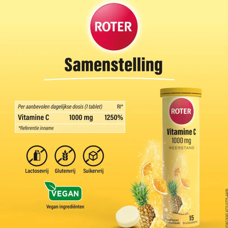 Roter Vitamine C 1000 mg bruis ondersteunt je natuurlijke weerstand. De suikervrije bruistabletten bevatten een hoge dosering vitamine C en hebben een lekker sinaasappel-ananassmaak. De bruistabletten zijn ook verkrijgbaar in zwarte bes-appelsmaak of lime-lycheesmaak. Vitamine C draagt naast ondersteuning van je weerstand bij aan de bescherming van gezonde cellen en weefsels tegen vrije radicalen. Vitamine C is tevens van belang voor het zenuwstelsel en kan helpen vermoeidheid te verminderen. Inname van vitamine C bevordert de energiestofwisseling en verhoogt het ijzergehalte in het bloed.