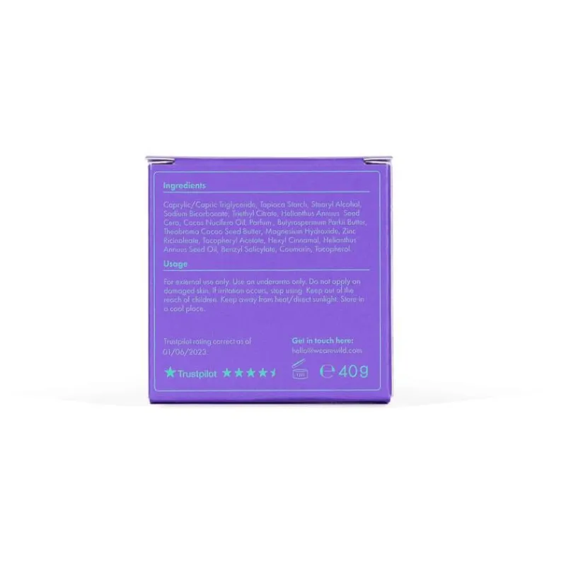 Tapioca Starch, Baking Soda, Sunflower Seed Wax, Cocoa Seed Butter, Tocopherol Acetate, Capric Glycerides, Coconut Oil, Stearyl Alcohol, Triethyl Citrate, Sunflower Seed Oil, Shea Butter, Magnesium Hydroxide, Zinc Ricinoleate, plus fragrance.