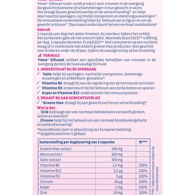 Het draagt bij aan gewichtsverlies en devetverbranding²* en helpt daarnaast bijopvliegers, nachtelijke transpireren enstemmingswisselingen¹*. De innovatievesamenstelling helpt bij behoud van je figuur enom op gewicht te blijven²*. Daarnaastondersteunt het een normaal metabolisme.Vitamine D3: ondersteunt bij het behoud vansterke botten en spieren. Koper en VitamineB12: ondersteunen het immuunsysteem.*Gezondheidsclaim in afwachting vanEuropese toelating.