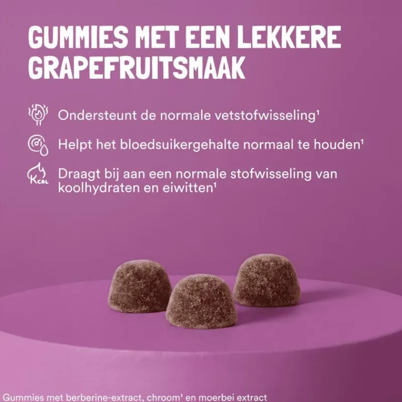 Yummygums Berberine Complex Gummies combineren chroom met berberine met moerbei. Chroom ondersteunt de vetstofwisseling en bloedsuikerspiegel. Met frisse grapefruitsmaak, vegan en suikervrij.