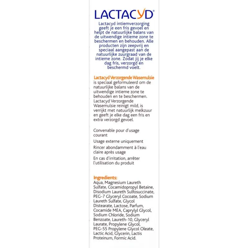 Lactacyd Wasemulsie Verzorgend is een milde wasemulsie voor de intieme verzorging en is geschikt voor dagelijks gebruik. Het geeft je intieme zone de dagelijkse bescherming die ze nodig heeft. De emulsie heeft dezelfde lage pH-waarde als de vagina en bevat lichaamseigen melkzuur dat helpt de natuurlijke balans van de vagina te behouden of te herstellen. Het wordt gebruikt om de beschermende omgeving te stabiliseren en te handhaven. Het ondersteunt hierdoor de natuurlijke bescherming van de vagina. Dit maakt het een ideaal verzorgingsproduct voor de intieme verzorging. Het geeft een fris en verzorgend gevoel. Respecteert de natuurlijke balans van de vagina.