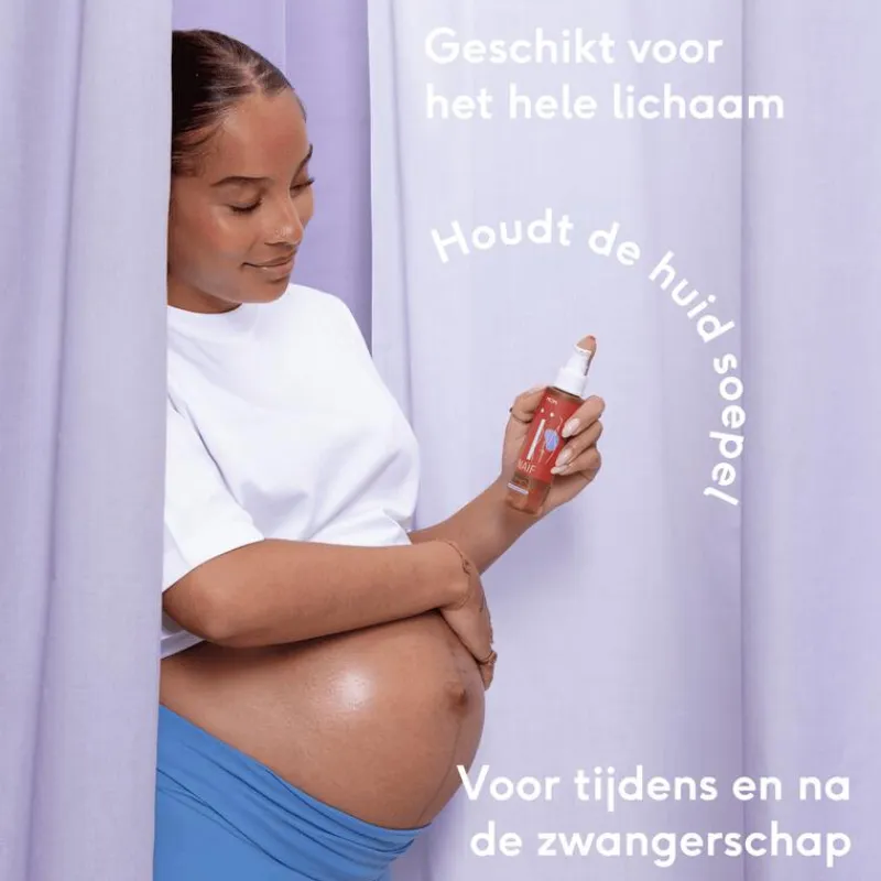 Extra tip: Onze Ontspannende Lichaamsolie hydrateert de huid met squalane en jojoba-olie, waardoor deze soepel en zacht blijft. Squalane ondersteunt de vochtbalans en beschermt tegen uitdroging. Jojoba-olie voedt intensief en versterkt de natuurlijke barrièrefunctie van de huid, voor optimale verzorging tijdens je zwangerschap.