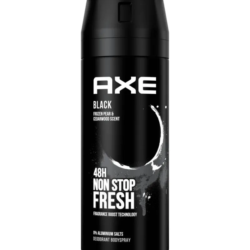 Ruik onweerstaanbaar fris met AXE Black Deodorant Bodyspray. Leef het dagelijkse frisse leven. Je weet nooit wat er kan gebeuren, dus heb je een bodyspray nodig om de hele dag heerlijk te blijven ruiken. AXE Black Deodorant Bodyspray met geurbestrijdende zink, verhoogd met 5% Zink-Zap technologie, stopt ongewenste lichaamsgeur en geeft je langdurige bescherming. Geniet 48 uur lang van de stimulerende geur van bevroren peer en cederhout. Wat er ook op je pad komt, met AXE ben je er klaar voor. De hele dag door.