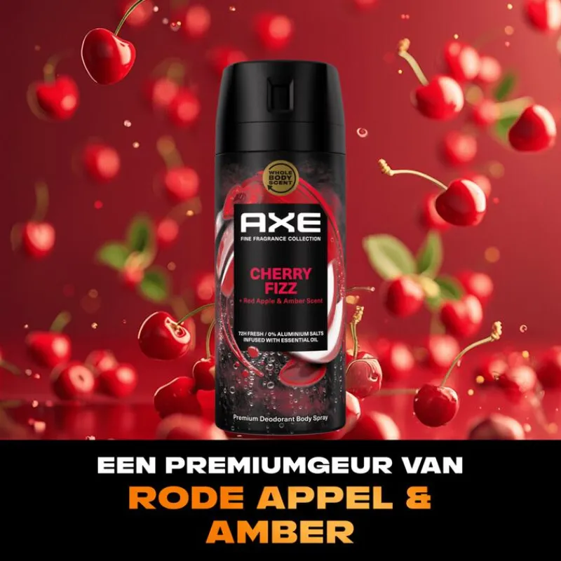 AXE Fine Fragrance Collection Cherry Fizz Premium Deodorant Bodyspray met de geur van rode appel en amber ruikt als een luxe parfum en beschermt effectief als een deo.