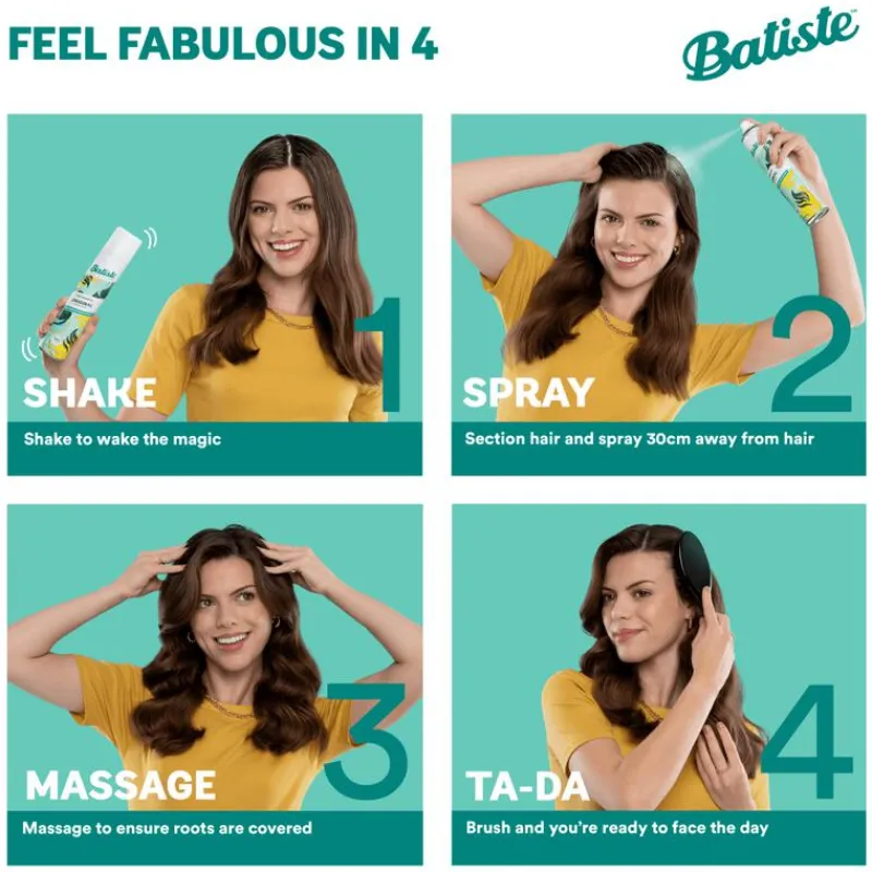 VOEL JE GEWELDIG IN 4 STAPPEN. 1.Schud een paar seconden om de magie wakker te maken. 2.Verdeel het haar in secties en spray richting je haarwortels (vanaf 30cm om precies te zijn) 3.Hussel het door elkaar met je vingertoppen en geef jezelf een kleine hoofdmassage om er zeker van te zijn dat je wortels bedekt zijn. 4.Borstel lichtjes om overtollige resten te verwijderen. Je bent klaar voor de wereld.