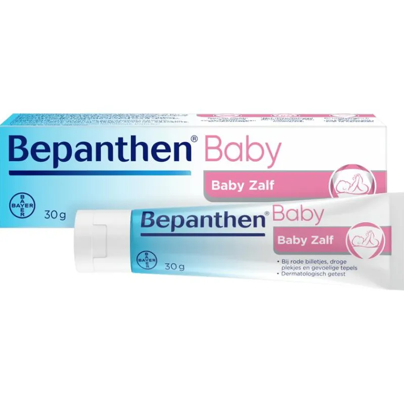 Rode babybilletjes?! Door wrijving en het contact van het babyhuidje met urine en ontlasting kunnen rode babybillen (of luieruitslag) ontstaan, die voor pijn en jeuk bij je baby’tje kan zorgen. Dit kan heel vervelend zijn! Gebruik Bepanthen Baby Zalf voor de verzorging en verzachting van rode babybilletjes. De BabyZalf (billenzalf baby) beschermt de babybillen tegen urine en ontlasting. Het bevat onder andere een hoge concentratie dexpanthenol. Dit beschermt babybilletjes en ondersteunt het huidherstel zonder een niet-doorzichtige witte laag achter te laten. Door de speciale samenstelling vormt de zalf een beschermend laagje op de huid. Het doorzichtige laagje van Bepanthen sluit de huid niet af maar laat haar ademen. De babyhuid wordt beschermd en haar natuurlijke kracht en evenwicht blijft behouden. De zalf is zorgvuldig samengesteld en bevat geen parfum, kleurstoffen en conserveermiddelen; pure en zachte bescherming! .Naast rode babybilletjes is Bepanthen Baby Zalf ook zeer geschikt voor:• Gevoelige en kwetsbare huidplooitjes van jouw baby• Verzorging van gevoelige en schrale tepels bij borstvoeding (tepelkloven, tepelkloven zalf)• Droge huidplekjes zoals wangen, ellebogen, handen of kniën Waarom een zalf? Baby zalf (zalf baby) vs baby crème (baby creme, billencrème, luiercrème)Een zalf bestaat voor het grootste gedeelte uit vet. Na het smeren blijft er een vetlaagje achter op je huid dat meestal een tijdje blijft zitten. Naast intensieve verzorging, beschermt een zalf dus ook je huid tegen invloeden van buitenaf. Crèmes bevatten meer water en leggen geen laagje. Daarom adviseren wij bij de verzorging en bescherming van de tere babyhuid een baby zalf in plaats van een baby crème.* Bepanthen bevat dexpanthenol. Deze stof heeft de bekende eigenschap het huidherstel te ondersteunen.