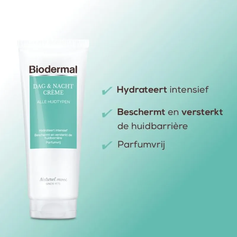 Biodermal dag & nachtcrème voor alle huidtypen is een effectieve en rijke crème. De crème combineert de verzachtende eigenschappen van een dagcrème met de voedende en herstellende eigenschappen van een nachtcrème.Ontdek de voordelen: