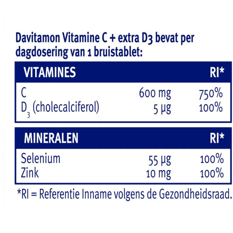 Davitamon Vitamine C Forte + extra D3 combineert een hoge dosering vitamine C (750% van de ADH) met vitamine D (200% van de ADH), selenium (100% van de ADH) en zink (100% van de ADH) in één bruistablet en is daarom:
