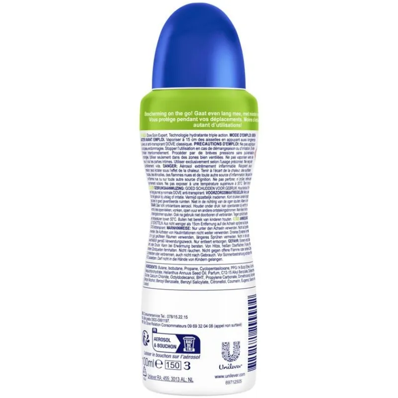 Dove ondersteunt vrouwen wereldwijd bij het realiseren van hun volledige potentiële en individuele schoonheid door verzorgingsproducten te ontwikkelen die inspelen op de persoonlijke behoeften van hun huid en haar. Want wij geloven dat wie zich mooi en lekker in zijn vel voelt met de hulp van de juiste verzorging, dat ook kan uitstralen. Om de impact op het mileu te verminderen hebben de Dove anti-transpiranten en deodoranten een andere verpakking gekregen. De aluminium spuitbus van deze anti-transpirant is 100% en oneindig recyclebaar. Deze compressed anti-transpirant is met zijn kleinere verpakking ook beter voor het milieu. De Dove anti-transpirant deodorants zijn vegan en dragen het PETA-approved keurmerk.
