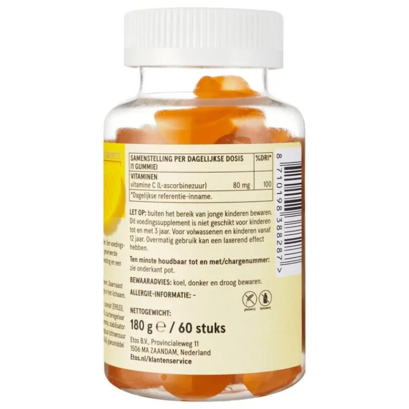 Etos Vitamine C gummies met citroensmaak. Vitamine C ondersteunt het immuunsysteem. Daarnaast activeert vitamine C de natuurlijke energie in het lichaam. Voedingssupplement met zoetstoffen.