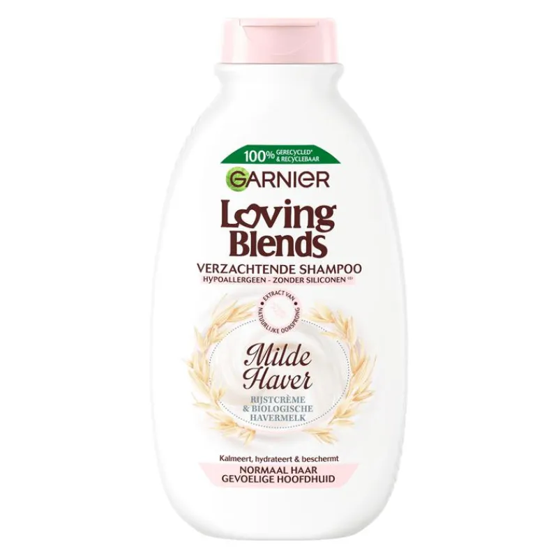 De Loving Blends Milde Haver Shampoo van Garnier is een hypoallergene shampoo (ECARF gecertificeerd), speciaal ontwikkeld voor normaal haar en een gevoelige hoofdhuid. De shampoo kalmeert, hydrateert en verzacht het haar en de hoofdhuid, en beschermt het haar over de gehele lengte. Garnier Loving Blends heeft een formule samengesteld die twee zachte ingrediënten combineert: – Rijstcrème, bekend om zijn hydraterende en beschermende werking op het haar. – Biologische havermelk, gebruikt om de gevoelige huid te verzorgen en bekend om de kalmerende en verzachtende werking op de gevoelige hoofdhuid. Het haar is gehydrateerd en perfect verzorgd, zonder te verzwaren. Het haar voelt heerlijk zacht aan, valt soepeler en heeft een stralende glans. Daarnaast wordt het haar beschermd over de gehele lengte. De hoofdhuid wordt onmiddellijk gekalmeerd en voelt weer comfortabel aan. Formule zonder siliconen, voor een natuurlijk gevoel en zonder dierlijke ingrediënten & bijproducten in een 100% gerecyclede en recyclebare fles. Loving Blends is gecertificeerd door Cruelty Free International. Ontdek voor nog meer verzorging ook de bijhorende conditioner en het haarmasker.