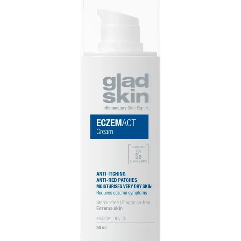 Verlicht symptomen van eczeem, zoals jeuk en roodheid, met Gladskin Eczemact Cream. Dit medisch hulpmiddel balanceert het huid microbioom, verzacht de droge huid, en vult de huid lipiden aan. Parfumvrij, hypoallergeen, en geformuleerd voor de gevoelige huid. Geschikt voor babies vanaf 3 maanden