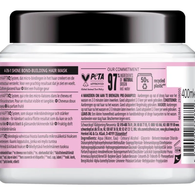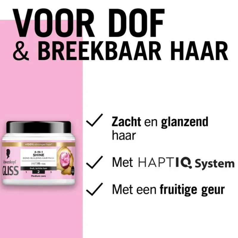 Wanneer de haarstructuur oneffen is op het oppervlak, wordt het broos en dof. Het heeft intensieve voedende verzorging nodig om te herstellen en weer glad en zijdezacht te worden. Deze Gliss glansmaskerbehandeling combineert het HAPTIQ System en zijde om het haar diep te herstellen en te laten glanzen. Het masker heeft een lichtgewicht crèmige textuur, biedt intense voeding en maakt het haar glad en glanzend.