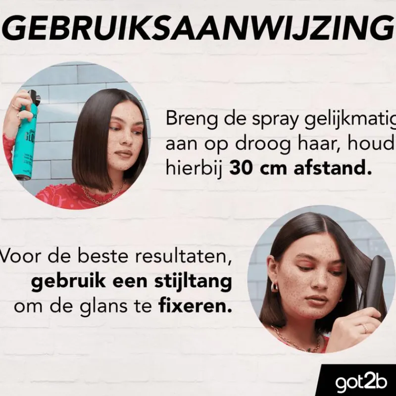 Spray gelijkmatig vanaf een afstand van 30 cm direct op je droge haar. Gebruik voor het beste resultaat een stijltang om de glans te lamineren. Voor een extra glanzende look, combineer met onze gotGloss Shine Primer.