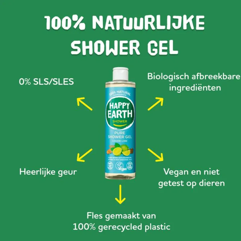 In HAPPY EARTH SHOWER GEL gebruiken we alleen ingrediënten waar jouw huid blij van wordt. Als je iets op je huid aanbrengt en door het doucheputje spoelt, is het fijn om te weten dat er geen vervuilende en vervelende ingrediënten in zitten zoals SLS/SLES, parabenen, kleurstoffen of andere nare toevoegingen. Daarom dragen wij met trots de keurmerken van NATRUE en Vegan Society. En onze shower gel-flessen zijn gemaakt van 100% gerecycled plastic. Zo zorg je niet alleen goed voor jezelf maar ook voor onze aarde!