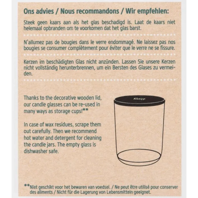 De Kneipp World of Fragrances zijn geïnspireerd door de natuur. De geuren met natuurlijke etherische oliën zijn niet alleen aangenaam voor de neus, maar beïnvloeden ook het welbevinden. Ze zorgen voor de juiste sfeer in huis en creëren een rustgevende omgeving. Een ideaal cadeautje als je iemand of jezelf een steuntje in de rug wilt bieden in een stressvolle situatie. Na gebruik kan de kaars met de decoratieve bamboe-deksel weer aromadicht worden afgesloten.