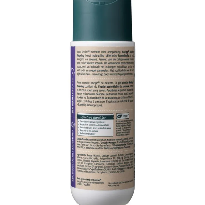 Deze heerlijk ontspannende Kneipp douche Relaxing – Lavendel bevat natuurlijke etherische lavendelolie voor een heerlijk moment van ontspanning onder de douche. Deze mild reinigende en verzorgende douchegel bevat verzorgende natuurlijke oliën om het vochtgehalte van de huid op peil* te houden en uitdroging van de huid te voorkomen. De natuurlijke huidbarrière blijft beschermd.
