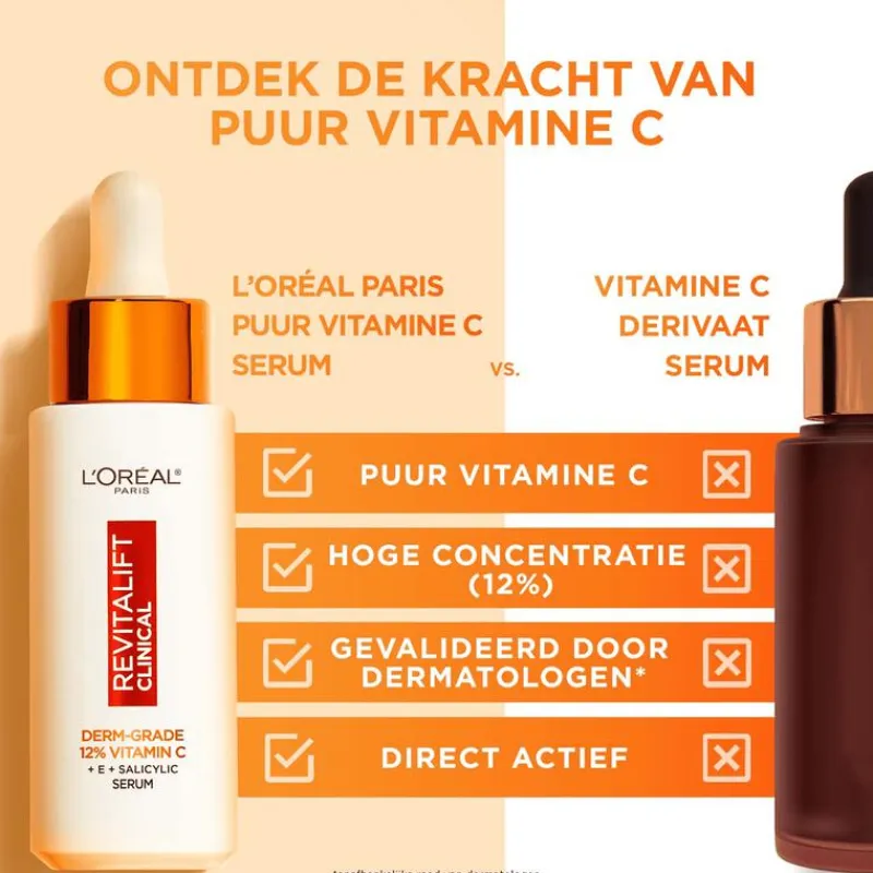 Ontdek het baanbrekende Clinical 12% Puur Vitamine C + E + Salicylzuur Serum van L’Oréal Paris Revitalift. Geformuleerd met puur en stabiele vitamine C in een hoge concentratie. Puur Vitamine C is een krachtige anti-oxidant dat helpt dofheid en de eerste tekenen van huidveroudering tegen te gaan. Bevat vitamine E, een actieve stof welke de verhelderende eigenschappen van vitamine C versterkt. Daarnaast helpt vitamine E het salicylzuur met het gladstrijken van de huidtextuur en het verminderen van zichtbare poriën.