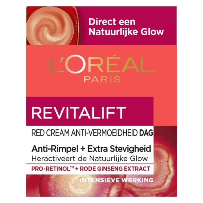 De L’Oréal Paris Revitalift Red Cream Dagcrème met Rode Ginseng bevat geavanceerde Pro-retinol, een ingrediënt wat effectief zorgt voor verminderde rimpels en helpt om de huid te egaliseren. Ook bevat het Rode Ginseng extract. Dit krachtige ingrediënt geeft de huid een boost om tekenen van vermoeidheid te bestrijden. Samen zorgt dit voor een natuurlijke glow.