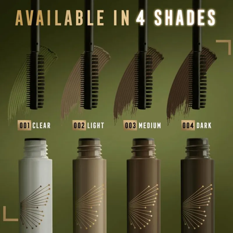 Deze wenkbrauwmascara is verkrijgbaar in één heldere kleur en vier getinte kleuren die in laagjes kunnen worden aangebracht.