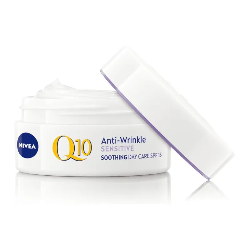 NIVEA Q10 POWER Sensitive Anti-rimpel Dagcrème is een verzachtende en verzorgende dagcrème die geschikt is voor de gevoelige huid. De speciale formule werkt niet alleen effectief tegen rimpels en fijne lijntjes, maar laat de huid ook steviger aanvoelen. Tegelijkertijd worden de drie tekenen van de gevoelige huid verminderd: roodheid, droogheid en een trekkerig gevoel. De dagcrème is parfumvrij en heeft een kalmerende werking, terwijl je ook van de bescherming van SPF 15 geniet. Zo wordt je huid beschermd tegen uv A/uv B, wat rimpelvorming helpt voorkomen, maar ook huidirritaties voorkomt. NIVEA Q10 POWER Sensitive Anti-rimpel Dagcrème bevat Q10 en creatine, die de collageenaanmaak stimuleren voor een stevigere huid en minder rimpels. Het toegevoegde zoethoutextract kalmeert en vermindert roodheid en irritatie, terwijl de formule dermatologisch is goedgekeurd. • Maakt rimpels en fijne lijntjes minder zichtbaar • Vermindert de drie tekenen van de gevoelige huid • Beschermt, voedt en verstevigt de huid • Met Q10, creatine en zoethoutextract • Met SPF 15
