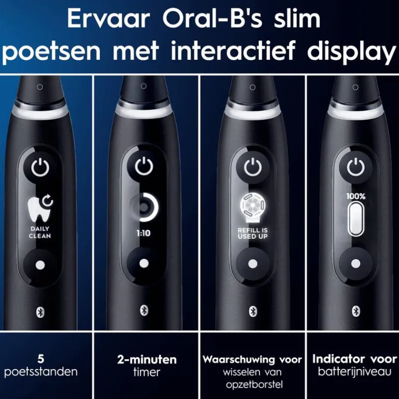 - Ervaar het slim borstelen van Oral-B: display om poetsstanden te selecteren, houd je poetstijd bij, vervang de navulkop op tijd en volg het batterijniveau