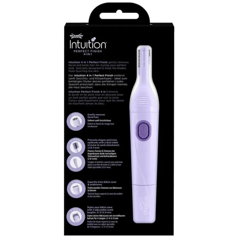 De Wilkinson Sword Intuition Perfect Finish 4-in-1 is de vrouwen trimmer en styler met 4 functies voor het gezicht, wenkbrauwen, oksels en bikini zone. Het verwijdert pijnloos en voorzichtig het gezichts- en lichaamshaar voor een natuurlijke glans van de huid. Het bevat een dubbelzijdige trimmer om je wenkbrauwen nauwkeurig te vormen en trimmen. Een trimmer voor de oksel en bikinizone met 4 verstelbare kamlengtes. Een opzetstuk om dons haartjes in het gezicht te verwijderen. Het apparaat is waterdicht en kan onder de douche worden gebruikt.