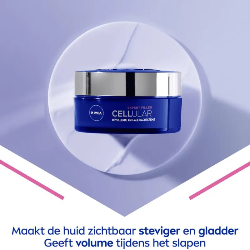 Verzorg en voed de huid met NIVEA CELLular Expert Filler Anti-Age nachtcrème. Deze antirimpelcrème verjongt de huid van binnenuit dankzij een speciale formule die huidveroudering effectief bestrijdt. Bij regelmatig gebruik geniet je van meer stevigheid, terwijl rimpels op een natuurlijke manier worden opgevuld. Gedurende de nacht wordt je huid op intensieve wijze gehydrateerd. ’s Nachts, wanneer je slaapt, is je huid het meest ontvankelijk voor de voedende bestanddelen in deze NIVEA nachtcrème. NIVEA Cellular Expert Filler Anti-Age Nachtcrème 50ml biedt 24 uur lang* een vullende werking voor een jonger uitziende huid. Met hyaluronzuur en collageen hydrateert deze nachtcrème intens en vermindert rimpels. Deze anti-age nachtcrème bevat ook puur foliumzuur, dat op cellulair niveau werkt en de steunvezels van de huid* sterker maakt, wat resulteert in een stevigere en vollere huid. Dermatologisch getest voor huidvriendelijkheid en veiligheid. *in vitro getest • Vult rimpels op natuurlijke wijze met een opvullend effect vanaf 24 uur* • Laat de huid zacht en gehydrateerd aanvoelen • Stimuleert de huidvernieuwing • Met collageenboost en hyaluronzuur • Bewezen verbetering van huidstevigheid • Verrijkt met puur foliumzuur voor celvernieuwing, hydratatie en twee varianten hyaluronzuur