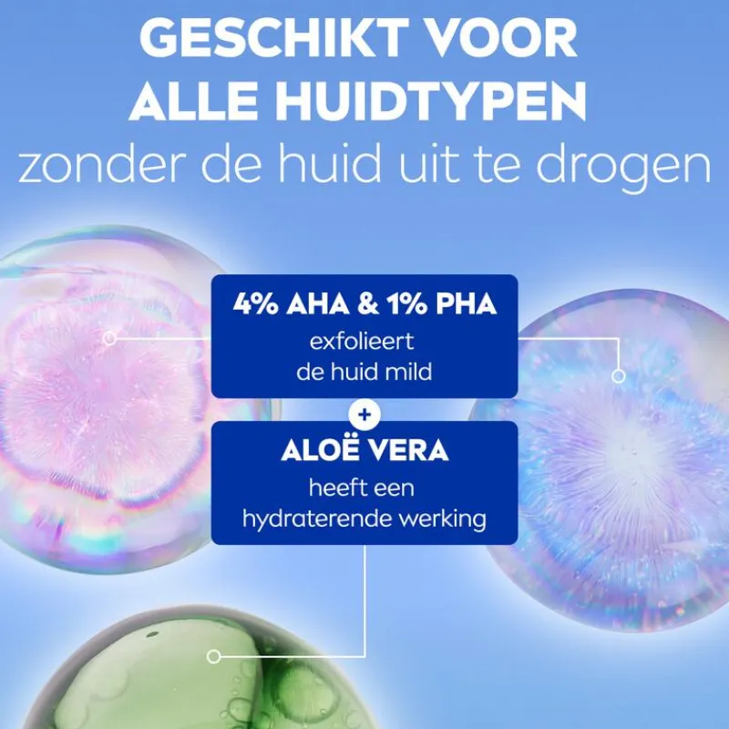 Zachte exfoliatie: stimuleert de vernieuwing van de huid met actieve ingrediënten 4% AHA & 1% PHA.
