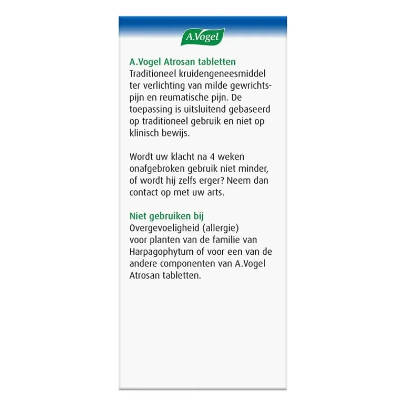 Pijnlijke gewrichten? Atrosan tabletten van A.Vogel is een natuurlijke pijnstiller bij milde gewrichtspijn en reumatische pijn, zoals door artrose of artritis. Atrosan bevat 480mg Harpagophytum (Duivelsklauw).