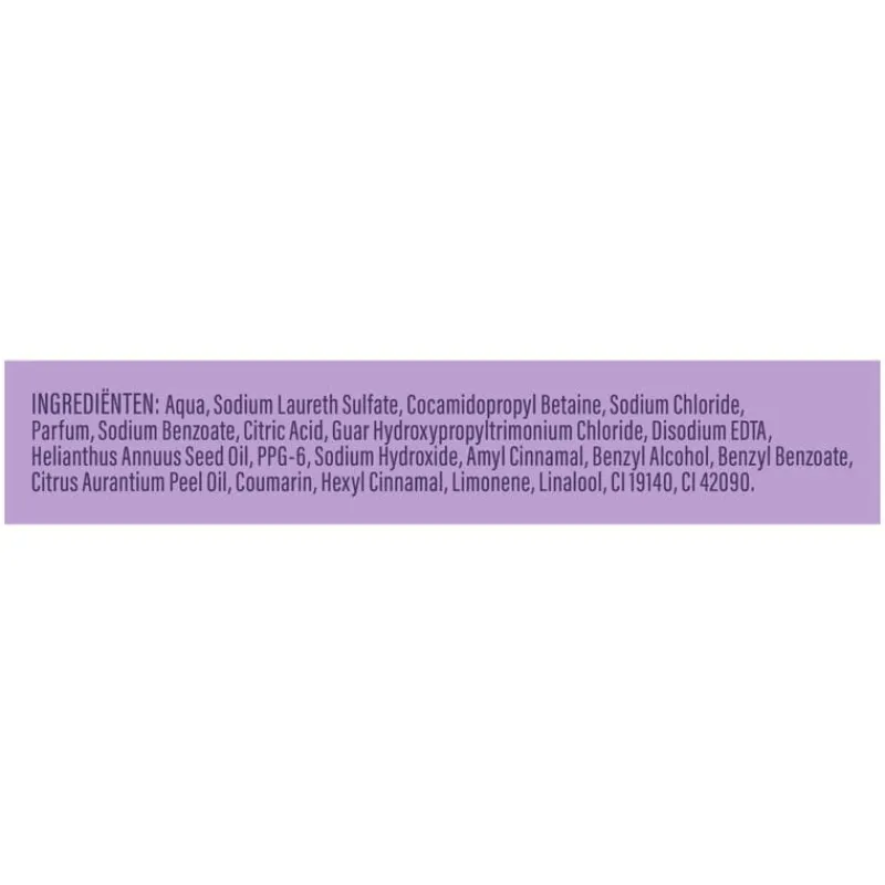 Aqua, Sodium Laureth Sulfate, Cocamidopropyl Betaine, Sodium Chloride, Parfum, Sodium Benzoate, Citric Acid, Guar Hydroxypropyltrimonium Chloride, Disodium EDTA, Helianthus Annuus Seed Oil, PPG-6, Sodium Hydroxide, Amyl Cinnamal, Benzyl Alcohol, Benzyl Benzoate, Citrus Aurantium Peel Oil, Coumarin, Hexyl Cinnamal, Limonene, Linalool, CI 19140, CI 42090.