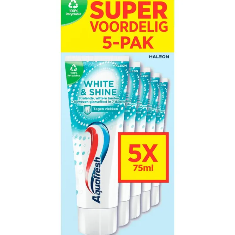 Aquafresh White & Shine tandpasta bevat microparels die het tandoppervlak op milde wijze (1) schoon, (2) glad en (3) witter maken – voor een klinisch bewezen glanseffect in 7 dagen en stralende, gladde, wittere tanden. Het is klinisch bewezen dat de Aquafresh White & Shine tandpasta helpt de tanden langer stralend wit te houden. Deze verpakking bevat 5 tubes White & Shine van ieder 75ml. Houd je mond gezond met de vertrouwde 3-voudige bescherming van Aquafresh tandpasta: gezond tandvlees, sterke tanden, frisse adem.