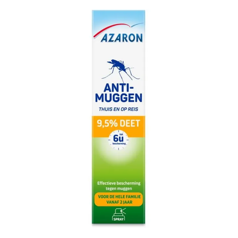 Azaron Anti-Muggen thuis en op reis spray met 9,5% DEET biedt tot 6 uur effectieve bescherming tegen de meest voorkomende muggensoorten in Nederland. Voor sommige tropische soorten kan de werkingsduur korter zijn, gemiddeld 2 uur bescherming tegen de gelekoortsmug of denguemug (welke o.a. het Zikavirus kunnen overdragen) en 5 uur tegen de malariamug. Voor de hele familie. Vanaf 2 jaar