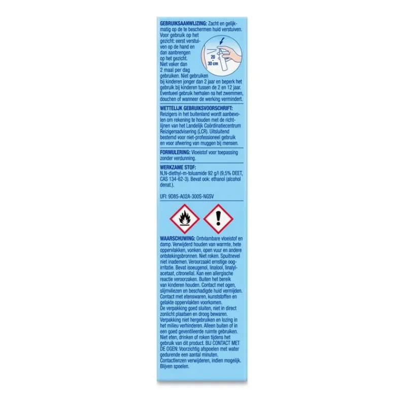 Gebruik biociden veilig. Lees vóór gebruik eerst het etiket en de productinformatie. WAARSCHUWING: ontvlambare vloeistof en damp. Veroorzaakt ernstige oogirritatie. Bevat Citronellal. Kan een allergische reactie veroorzaken. VEILIGHEIDSAANBEVELING: Buiten het bereik van kinderen houden. Verwijderd houden van warmte, hete oppervlakken, vonken, open vuur en andere ontstekingsbronnen. Niet roken. Spuitnevel niet inademen. Niet eten, drinken of roken tijdens het gebruik van dit product. Alleen buiten of in een goed geventileerde ruimte gebruiken. BIJ CONTACT MET DE OGEN: Voorzichtig afspoelen met water gedurende een aantal minuten. Contactlenzen verwijderen, indien mogelijk. Blijven spoelen.