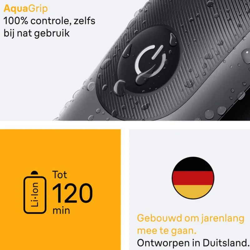 - Gebouwd om lang mee te gaan: 100% Waterdicht met AquaGrip voor controle, zelfs onder de douche. Duurzame Li-Ion batterij voor maximaal 120 minuten snoerloze gebruikstijd