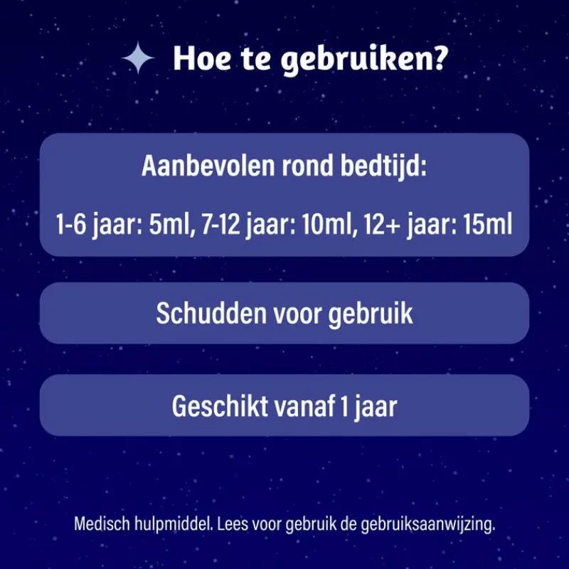 Dosering: Dampo Kids Alle Hoest Nacht is geschikt voor kinderen vanaf 1 jaar. De aanbevolen inname rond bedtijd is: – Van 1 t/m 6 jaar; 5 ml – Van 7 t/m 12 jaar, 10 ml – Van 13 t/m 18 jaar, 15 ml. Gebruik het bijgeleverde maatdopje. Sluit de dop goed na gebruik. Wanneer nodig kan de inname éénmaal per nacht worden herhaald. Lees voor gebruik de gebruiksaanwijzing. Vanwege de hoeveelheid plantenextracten kan het product kleine onopgeloste deeltjes bevatten; dit heeft geen effect op de kwaliteit. Dampo Kids Alle Hoest Nacht is een medisch hulpmiddel.