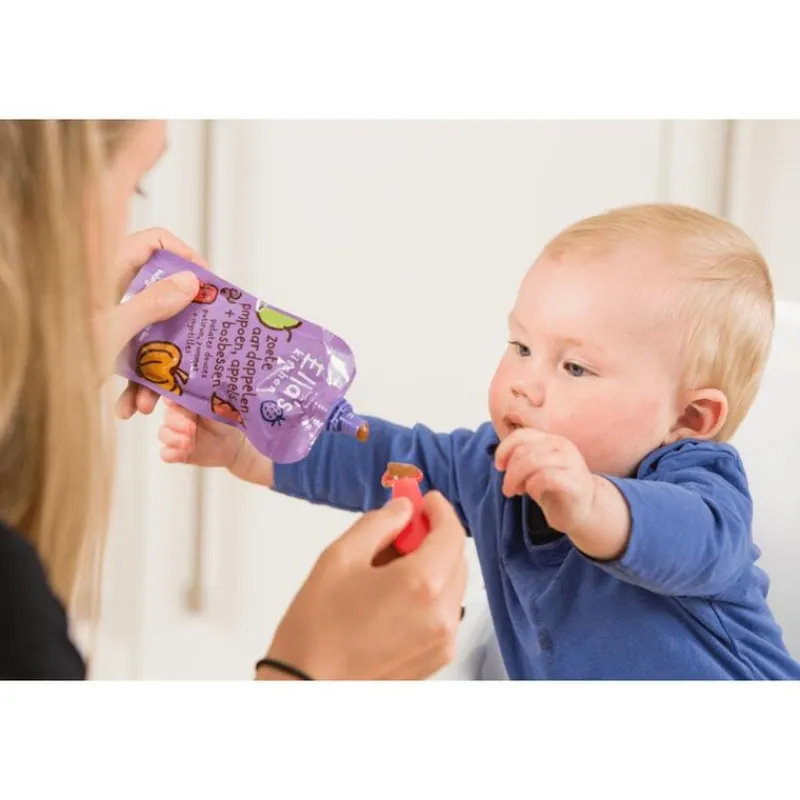 100% biologische babyvoeding. Knijpzakje met zoete aardappelen, pompoen, appels + bosbessen met een drupje citroensap en verder niets, zelfs geen water. Vanaf 4 maanden. Lekker + makkelijk. Yiehaaa!