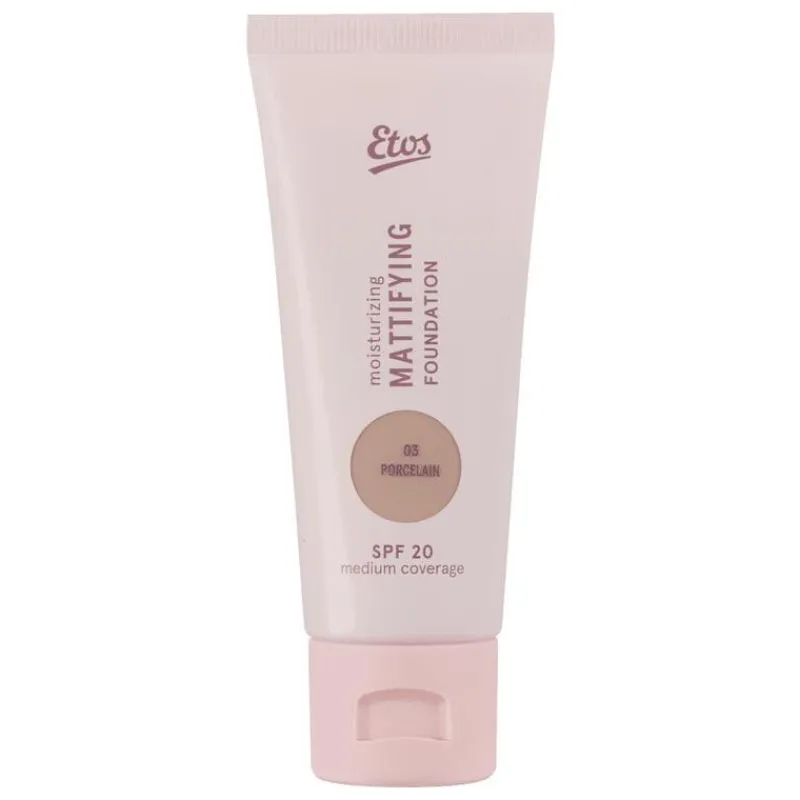 De Etos Moisturizing Mattifying Foundation SPF 20 in 03 Porcelain is ideaal voor een lichte huid met een neutrale ondertoon. Deze foundation biedt een matte finish die de hele dag blijft zitten en helpt bij het minimaliseren van poriën. Met een medium dekking zorgt het voor een egale teint en een frisse uitstraling.